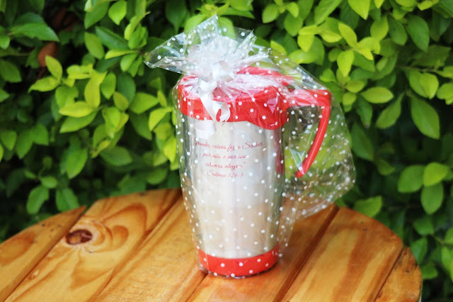 E essa caneca térmica personalizada, ganhei da bonita e simpática Karina que mais uma vez me surpreendeu e me emocionou. Gente!! Tem meu nome na caneca de um lado e um versículo do outro lado! Chique e meigo amei amei!