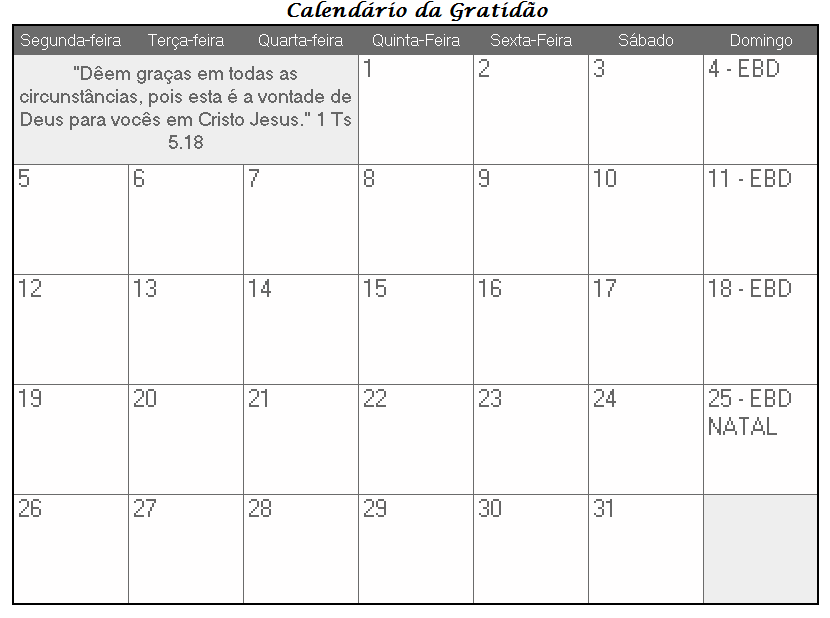 Então hoje, mesmo a essa hora, disponibilizo um calendário simples, de dezembro de 2016 (prometo que o calendário de janeiro sairá com mais capricho). Algo simples, mas que podemos imprimir e colocar em algum lugar bem visível, aqui em casa acabei de colocar na porta da geladeira, imprimi em papel sulfite mesmo. E me desafio a destacar um motivo de gratidão a Deus todos os dias a partir de hoje.